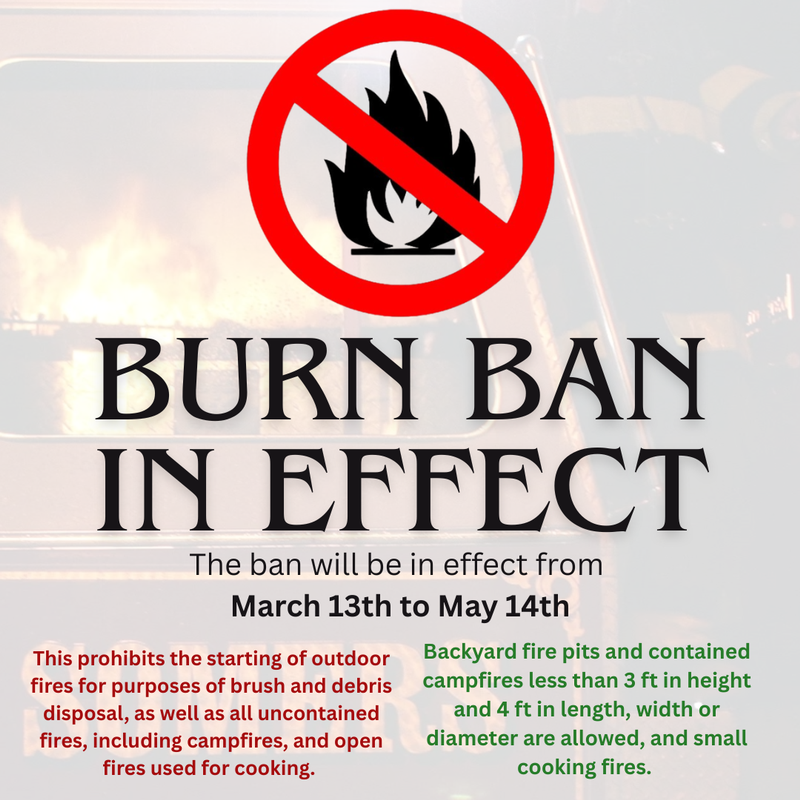 🚫 Burn Ban in effect (March 16 – May 14)